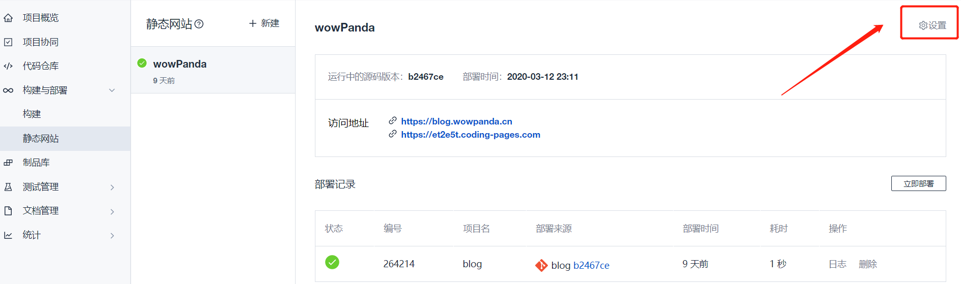 在上图左上角“设置”中,设置:网站名、绑定域名、是否强制https等